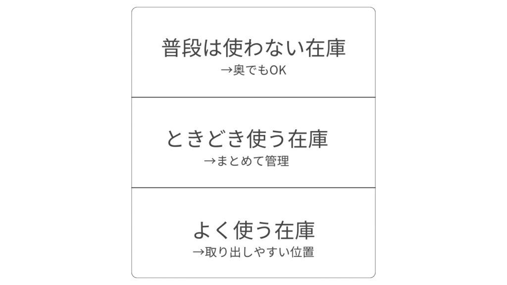 どの在庫を日常的に手に取っているのかが分かると、優先して置くべき場所が自然と見えてきます。